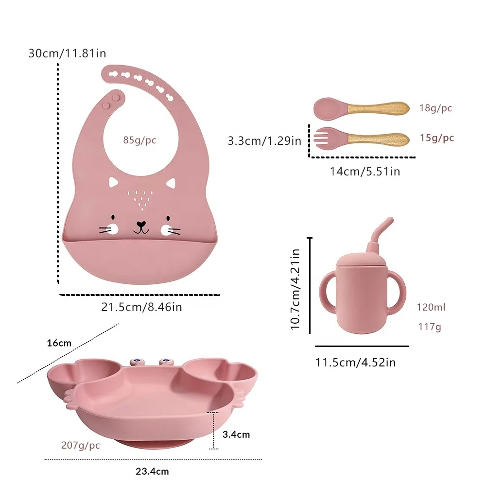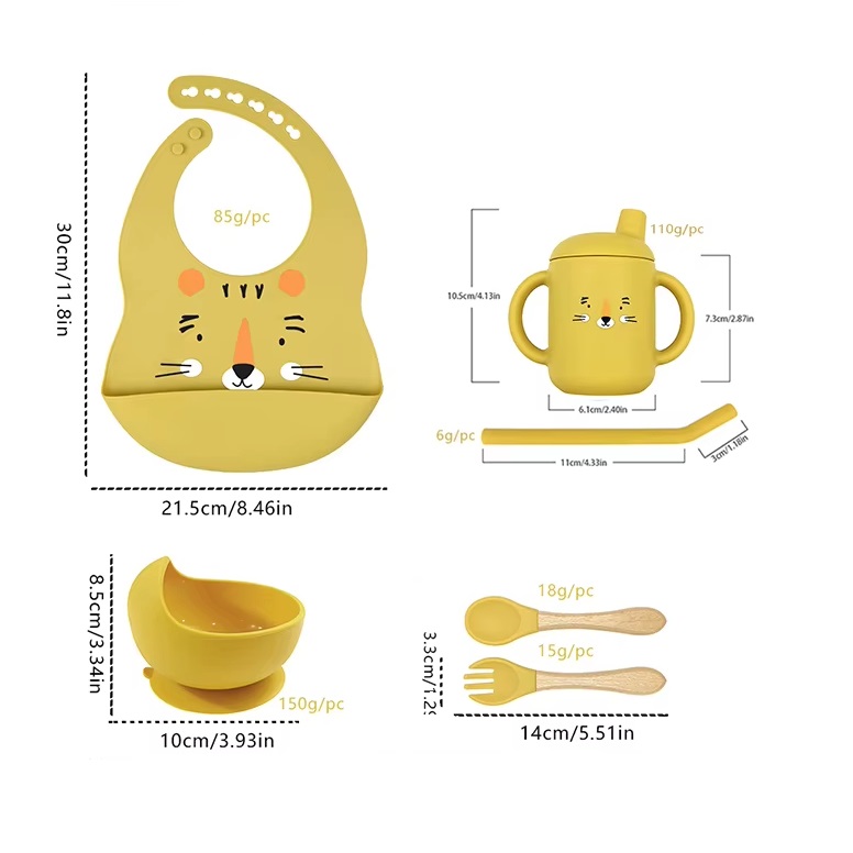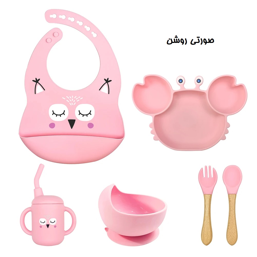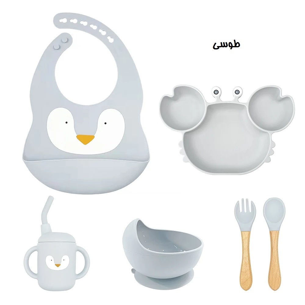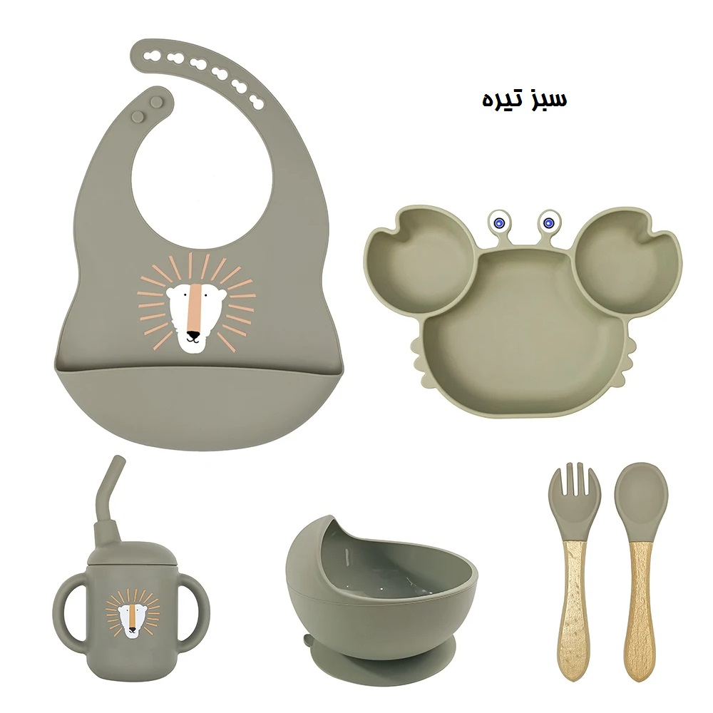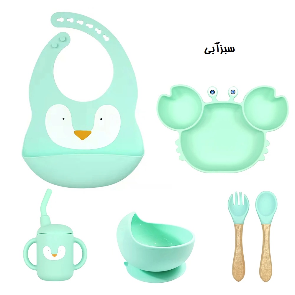 ظرف غذای سیلیکونی 6 تکه شامل پیشبند، بشقاب غذاخوری، کاسه، لیوان، قاشق و چنگال دسته سیلیکونی می باشد. جنس تمامی تکه ها سیلیکونی بوده و فاقد BPA ، لاتکس، Phthalate ، نیتروزامین است. از ویژگی های منحصربه فرد این ست می توان به آنتی باکتریال بودن، قابلیت استفاده در مایکروویو و فر، قابلیت قرار دادن ظروف در فریزر و شستشو با ماشین ظرفشویی اشاره کرد. لازم به ذکر است کاسه و بشقاب دارای پایه برای چسبیدن به سطوح می باشند .
