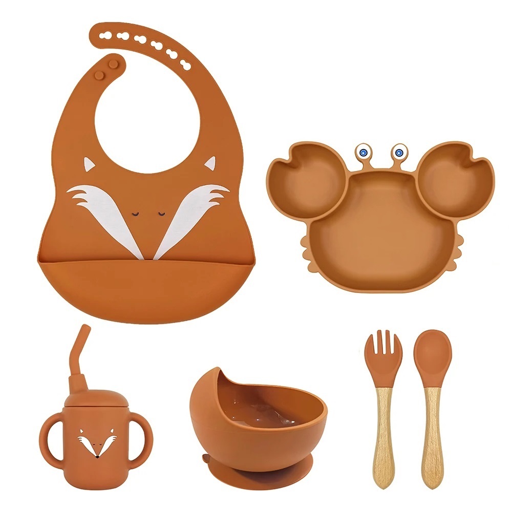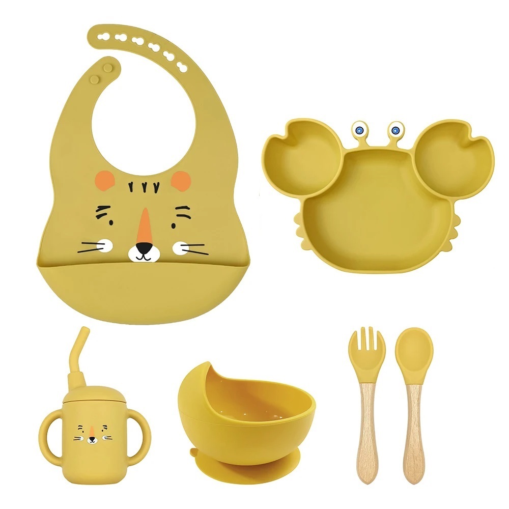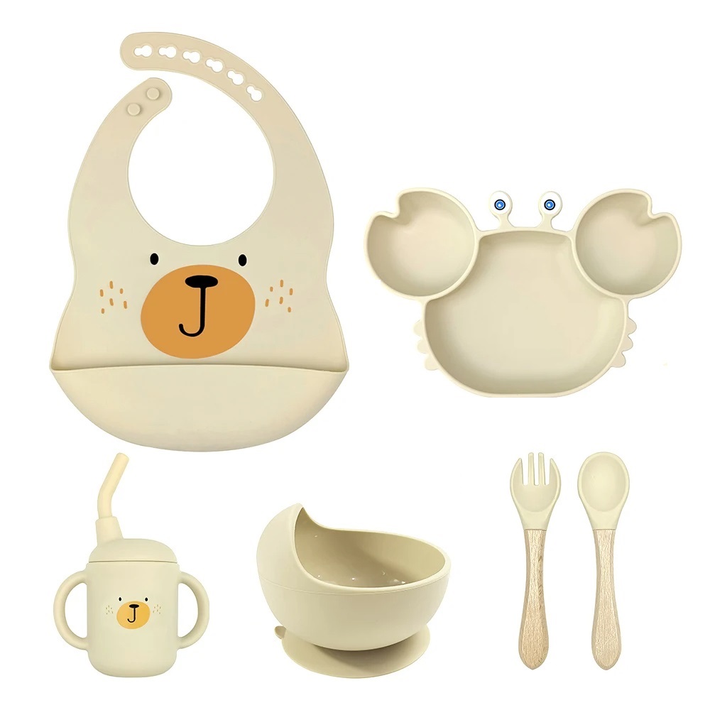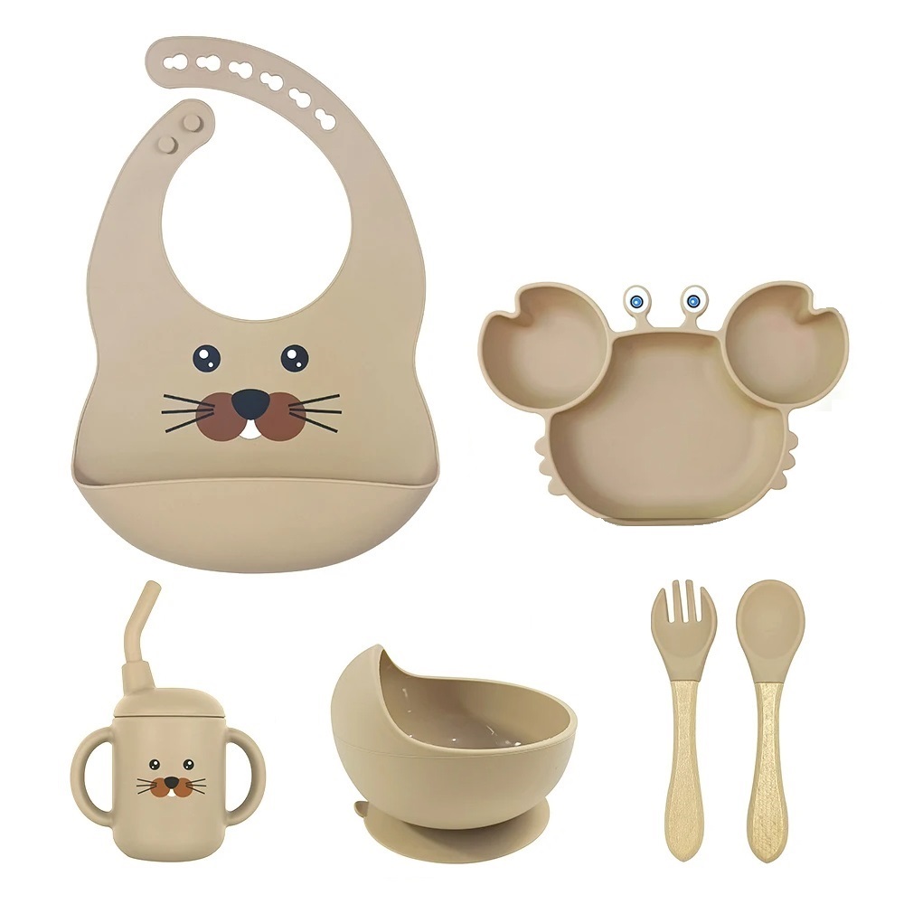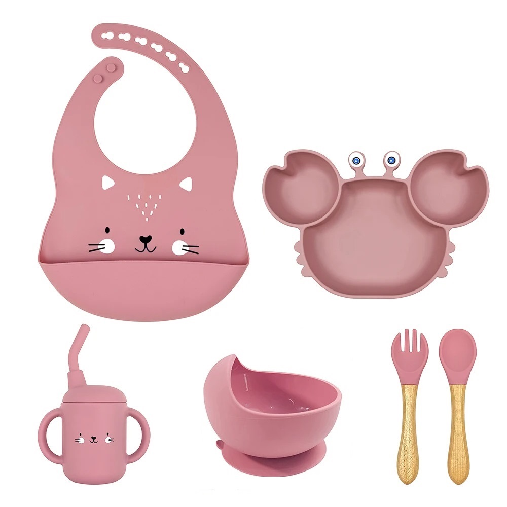 ظرف غذای سیلیکونی 6 تکه شامل پیشبند، بشقاب غذاخوری، کاسه، لیوان، قاشق و چنگال دسته سیلیکونی می باشد. جنس تمامی تکه ها سیلیکونی بوده و فاقد BPA ، لاتکس، Phthalate ، نیتروزامین است. از ویژگی های منحصربه فرد این ست می توان به آنتی باکتریال بودن، قابلیت استفاده در مایکروویو و فر، قابلیت قرار دادن ظروف در فریزر و شستشو با ماشین ظرفشویی اشاره کرد. لازم به ذکر است کاسه و بشقاب دارای پایه برای چسبیدن به سطوح می باشند .