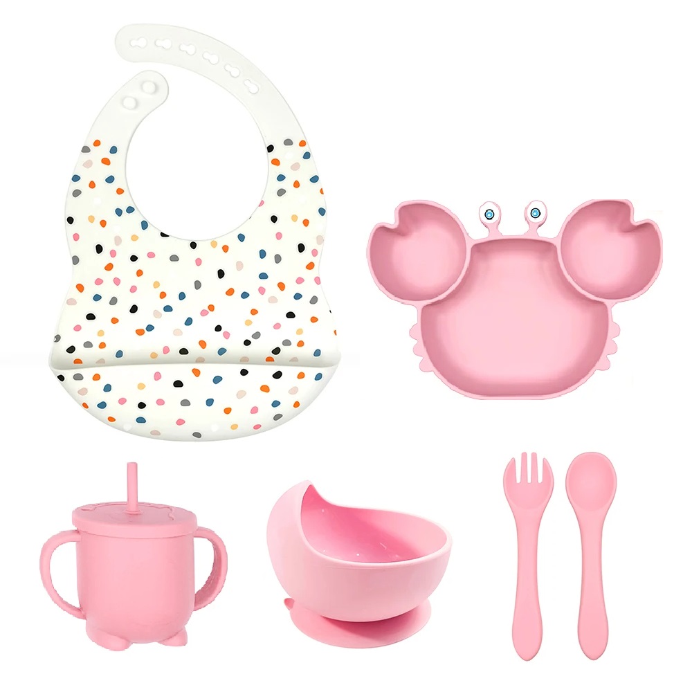 ظرف غذای سیلیکونی 7 تکه شامل پیشبند، بشقاب سه قسمتی غذاخوری، کاسه، لیوان، قاشق و چنگال، سری نی دار می باشد. جنس تمامی تکه ها سیلیکونی بوده و فاقد BPA ، لاتکس، Phthalate ، نیتروزامین است. از ویژگی های منحصربه فرد این ست می توان به آنتی باکتریال بودن، قابلیت استفاده در مایکروویو ، قابلیت قرار دادن ظروف در فریزر و شستشو با ماشین ظرفشویی اشاره کرد. لازم به ذکر است کاسه و بشقاب دارای پایه برای چسبیدن به سطوح می باشند.